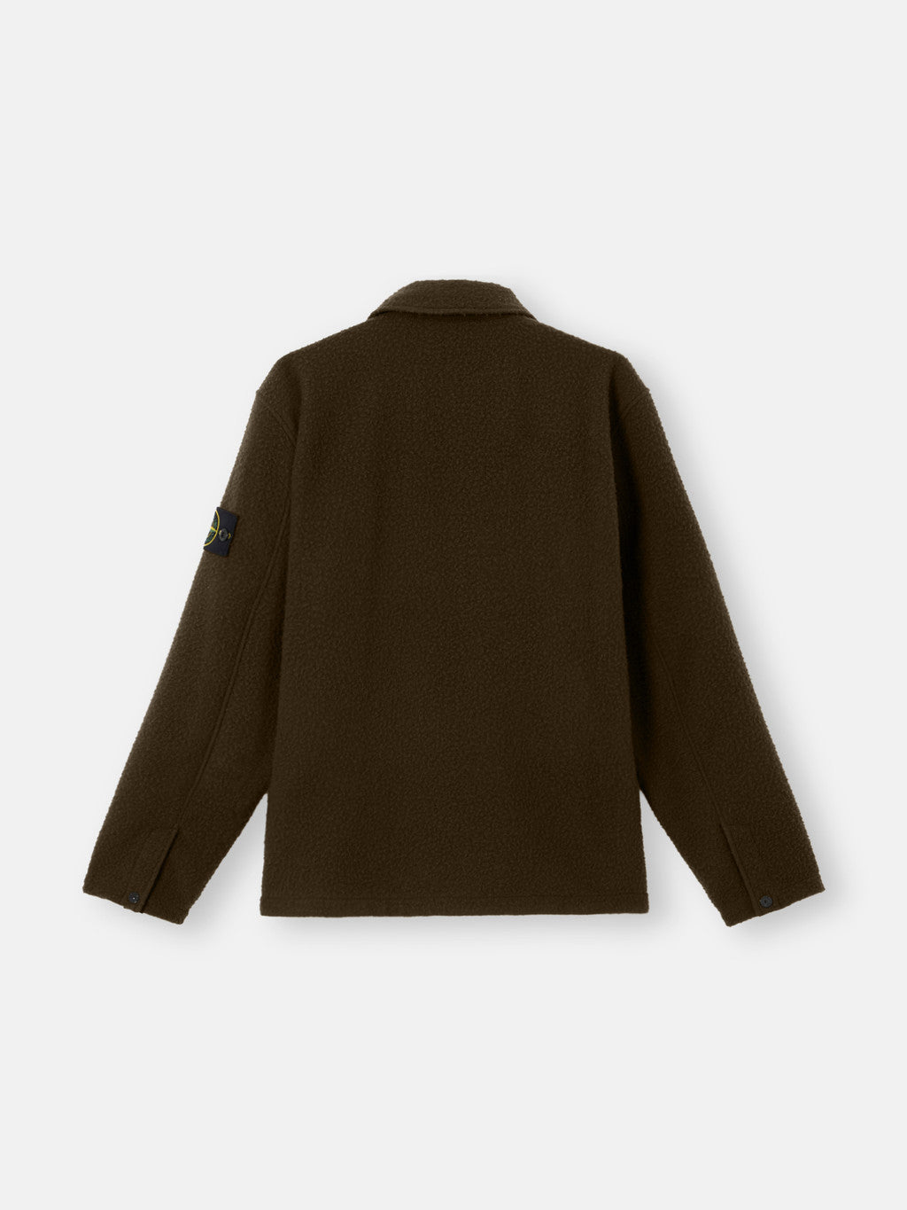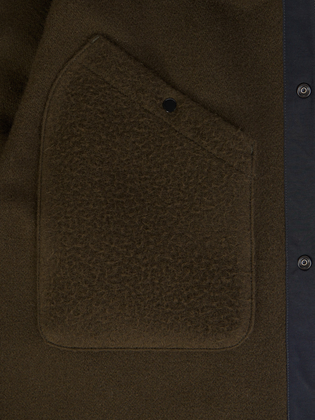 Overshirt made of a wool nylon cloth. The ratteen finishing process lends a characteristic knotted appearance to the surface.