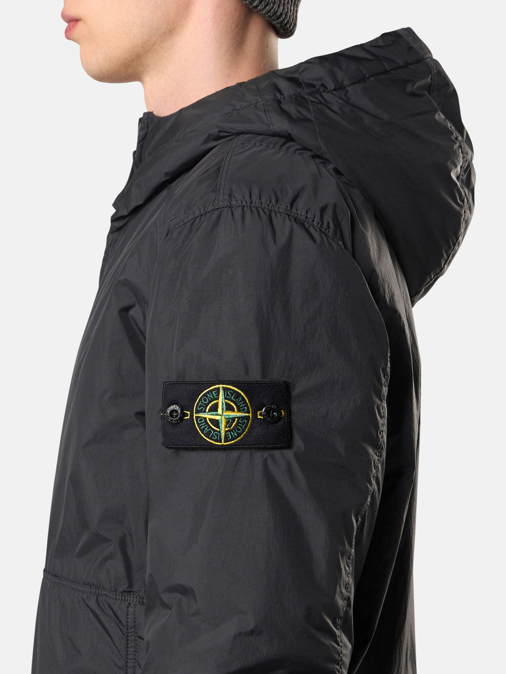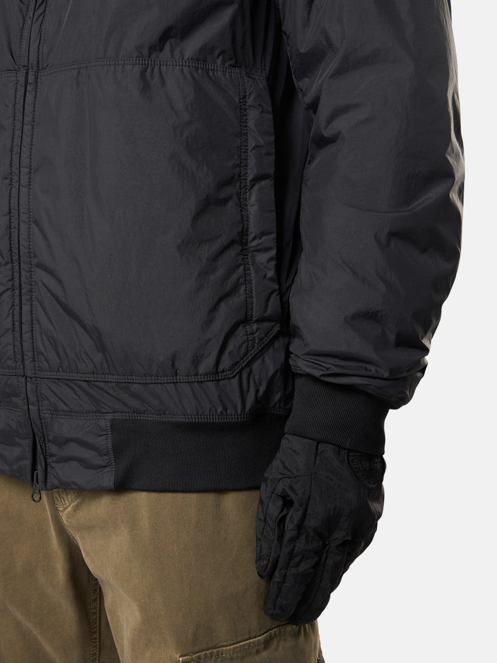 Padded jacket in a light recycled nylon rep with an ultra-tight weaving construction. The resin coating of its inner face makes it wind resistant and mildly water resistant. Due to the resin treating of the material, the colour penetrates unevenly into the material, lending a crinkled appearance to the surface. Padded with PrimaLoft -TC, an exclusive blend of high-performance insulating fibres, 70% recycled, engineered with Stone Island for garment dyeing. Garment dyed with the addition of a special anti-drop agent.