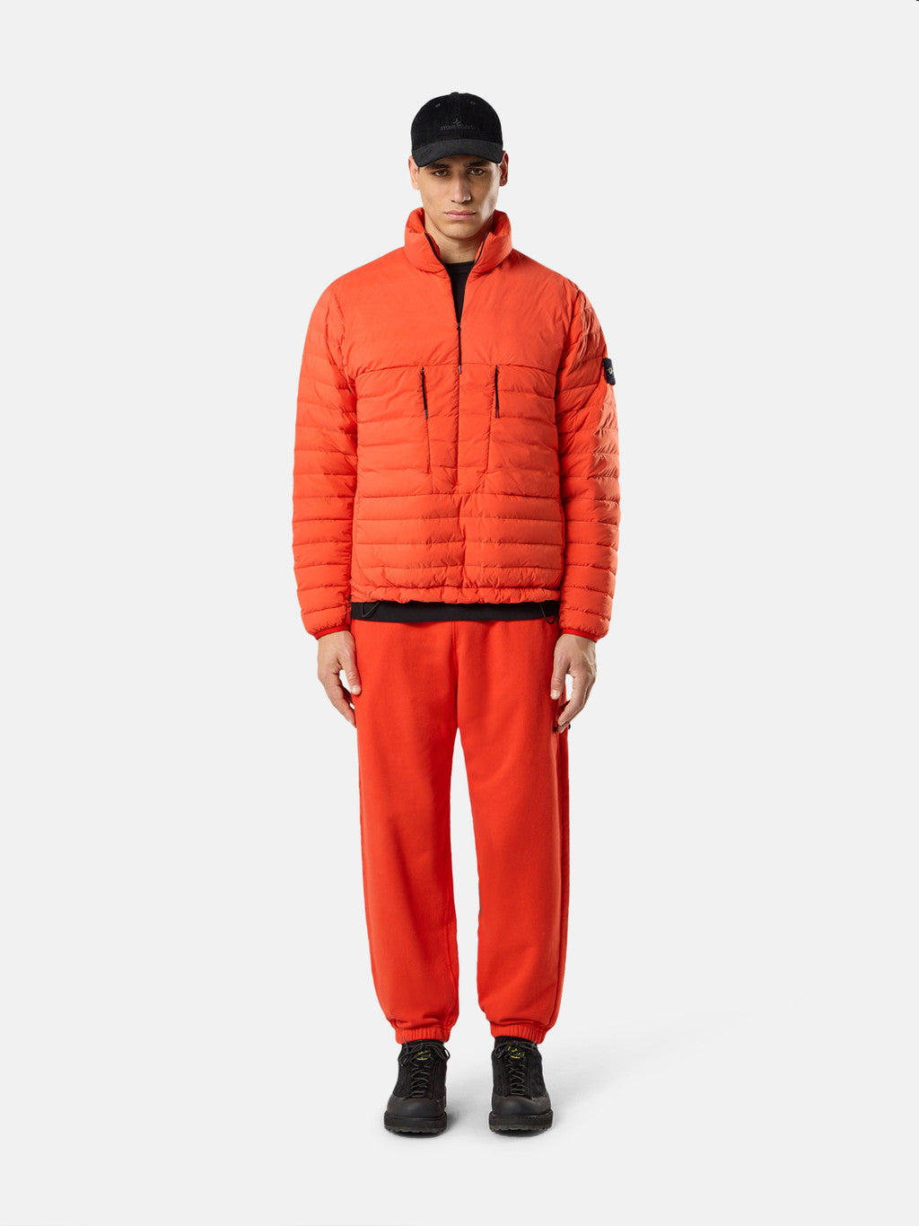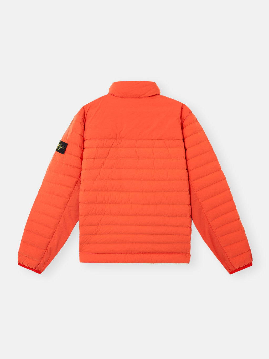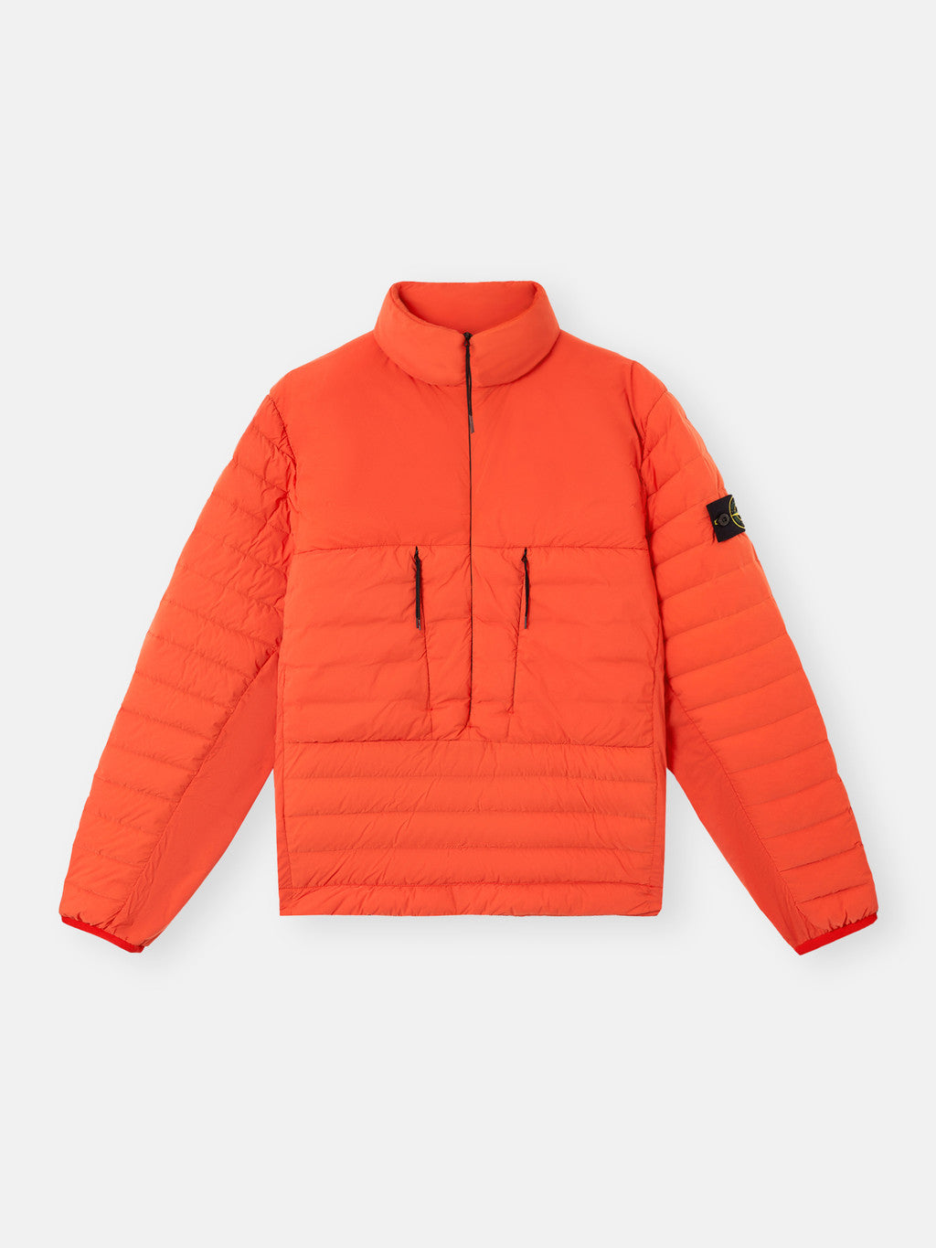 Down anorak in a light single layer stretch fabric made with 86% recycled nylon that undergoes a special weaving technique automatically creating the feather compartments directly from the loom. The seamless feather tunnels substantially increase the hold of the down. The finished garment is padded with direct injection with the finest feathers, specifically treated to resist garment dyeing. Garment dyed with the addition of a special anti-drop agent. RDS - Responsible Down Standard certified.