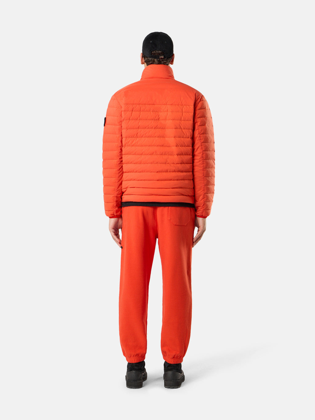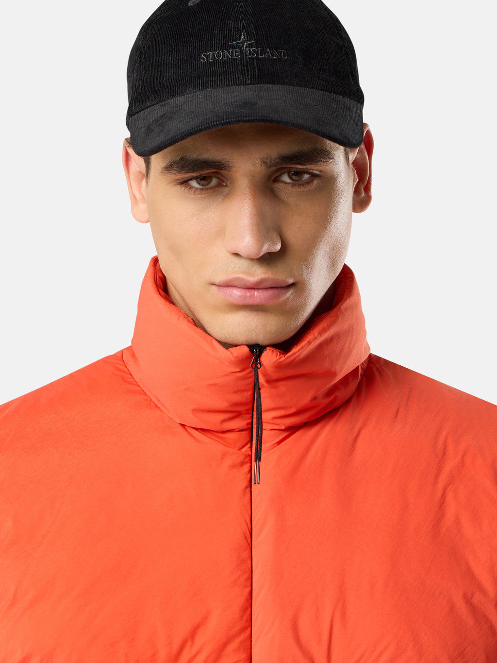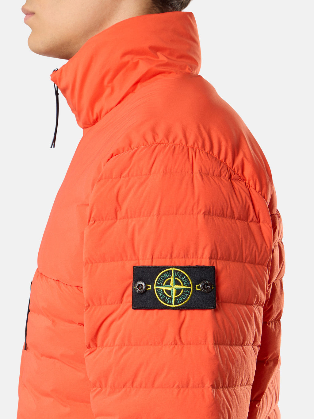 Down anorak in a light single layer stretch fabric made with 86% recycled nylon that undergoes a special weaving technique automatically creating the feather compartments directly from the loom. The seamless feather tunnels substantially increase the hold of the down. The finished garment is padded with direct injection with the finest feathers, specifically treated to resist garment dyeing. Garment dyed with the addition of a special anti-drop agent. RDS - Responsible Down Standard certified.