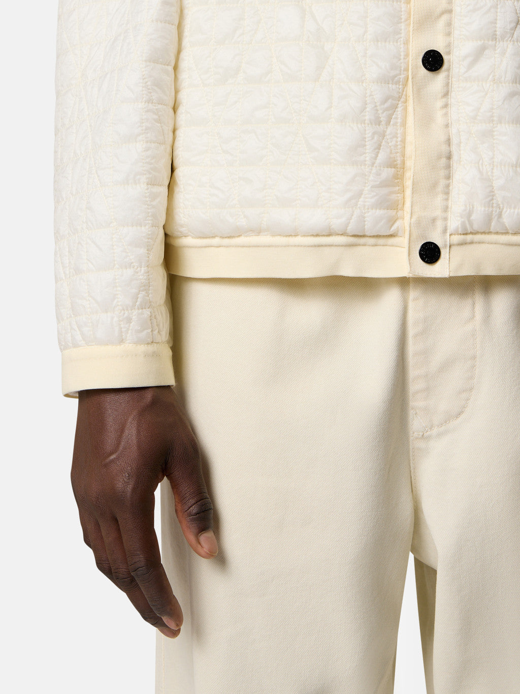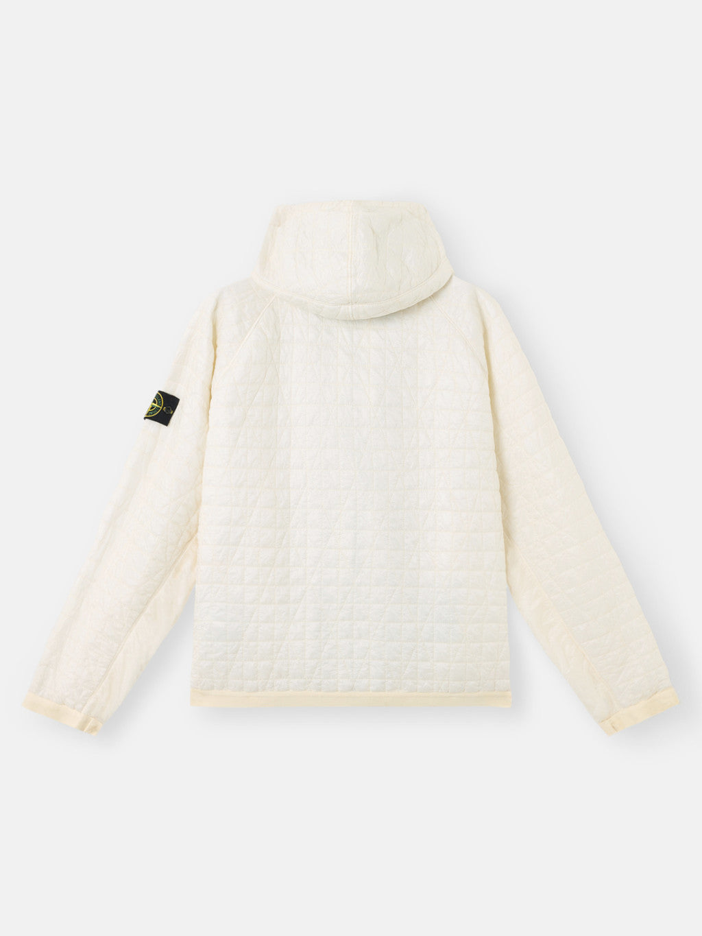 Padded hooded jacket in a light nylon rep with an ultra-tight weaving construction. The fabric features multiaxial quilting and an internal padding layer. The resin coating of its inner face makes it wind resistant and mildly water resistant. Due to the uneven penetration of colour into the resin-coated fabric, the dye bath lends a crinkled appearance to the surface. The addition of a special agent to the dye formula makes the piece anti-drop. Removable ribbed knit insert with hood.