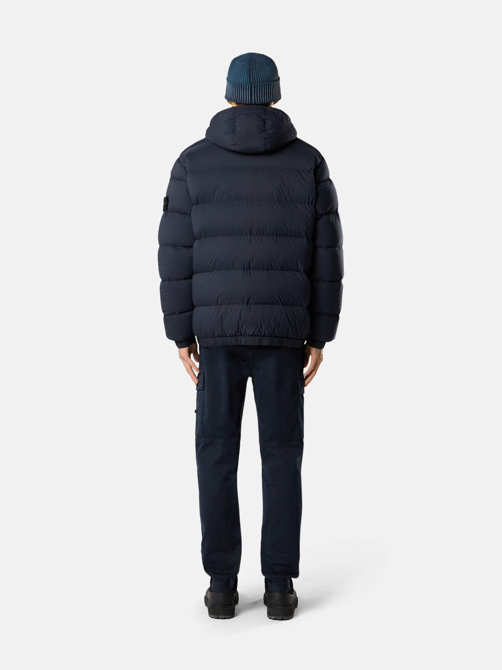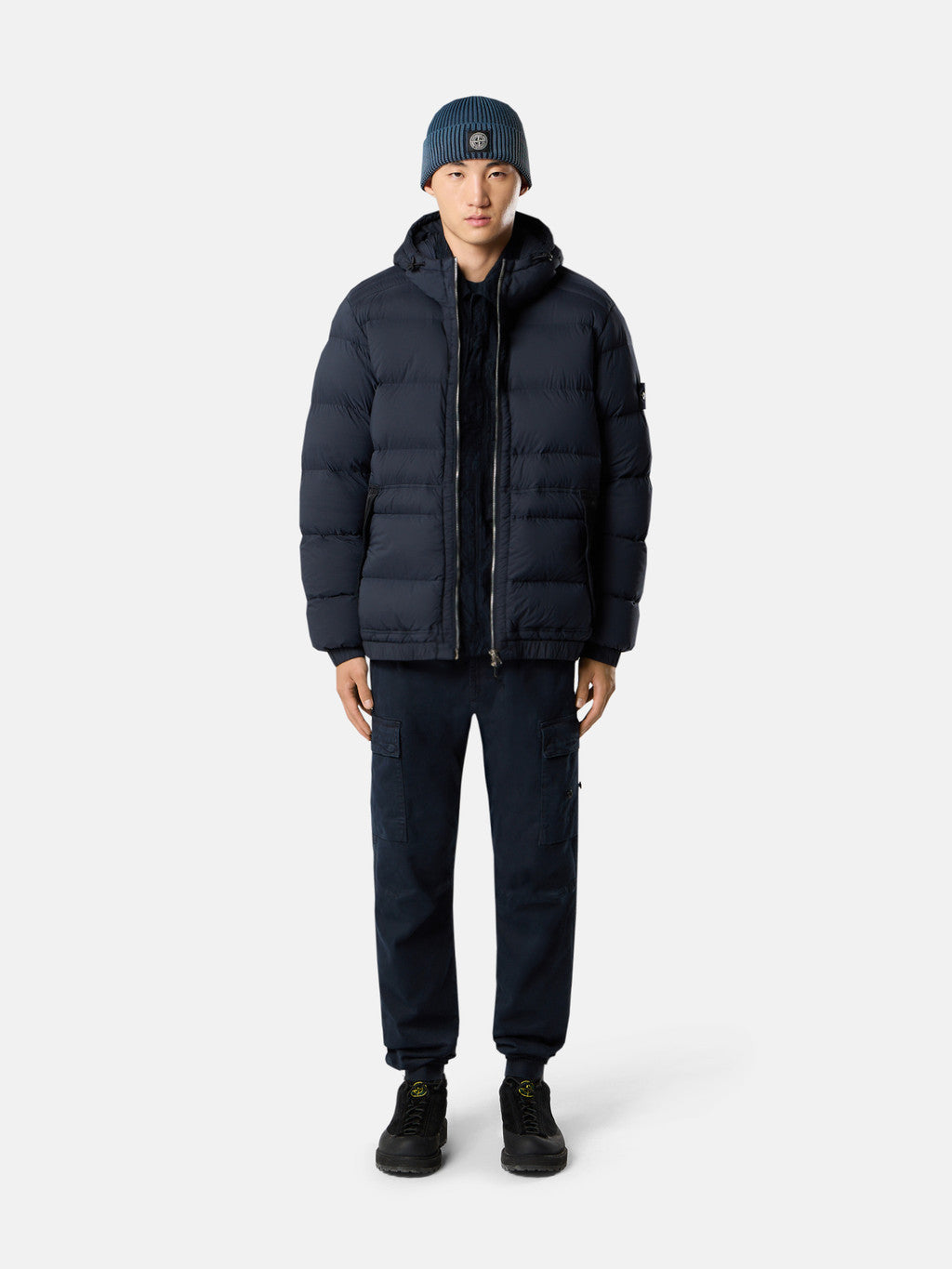 Hooded down jacket in a light stretch nylon single layer fabric undergoing a special weaving technique automatically creating the feather compartments directly from the loom. The seamless feather tunnels substantially increase the hold of the down. The finished garment is padded with direct injection with the finest feathers, specifically treated to resist garment dyeing. Garment dyed with the addition of a special anti-drop agent. RDS - Responsible Down Standard certified.