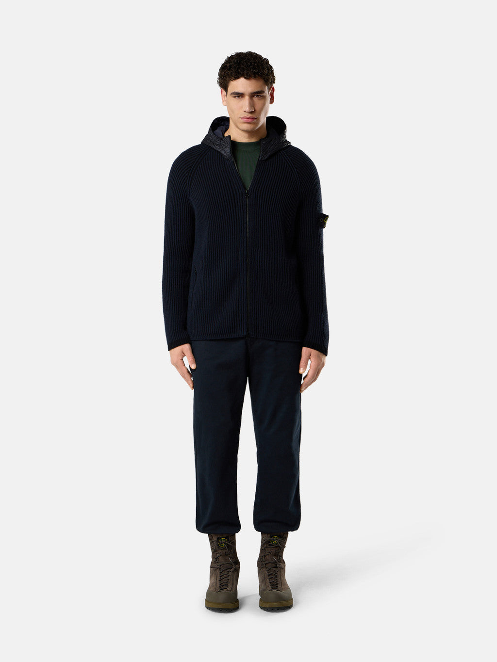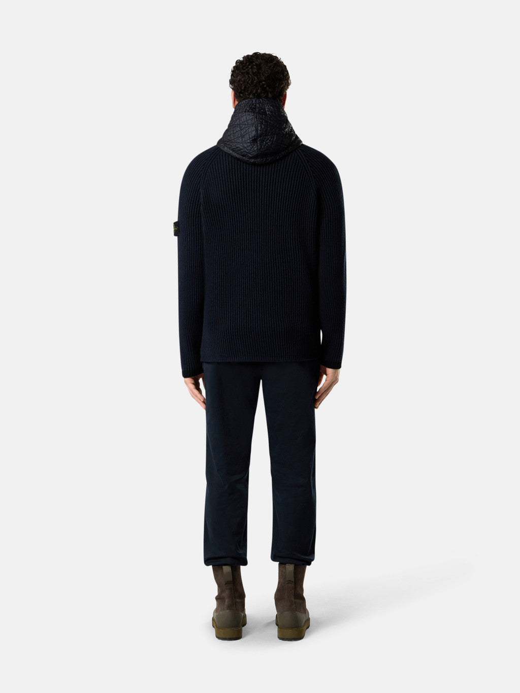 Knit hooded zip-up jumper in full rib RWS wool made from two different coloured yarns, worked with the VANISE technique to obtain a deeper perception of the rib and contrasting colour placements. Gauge 7.