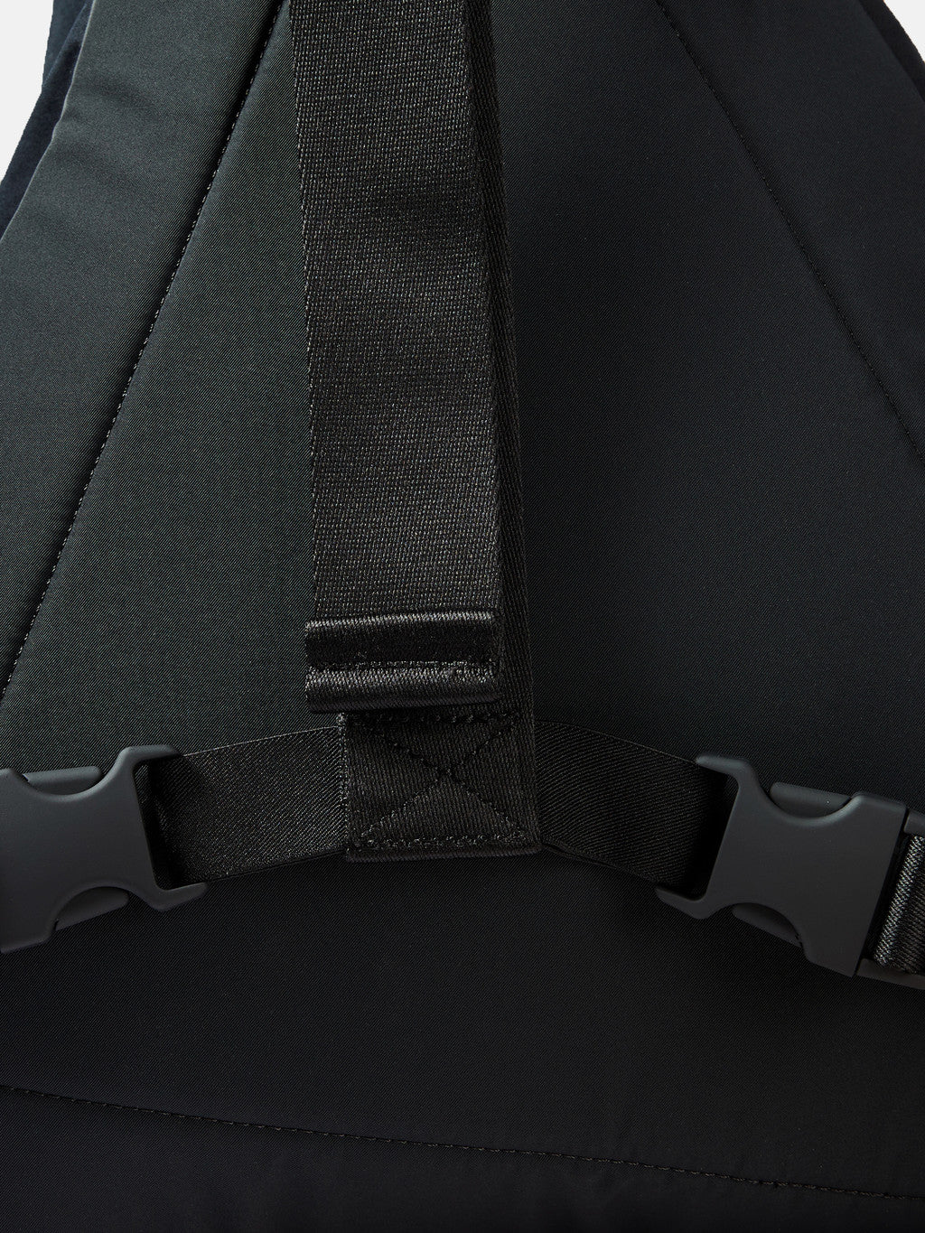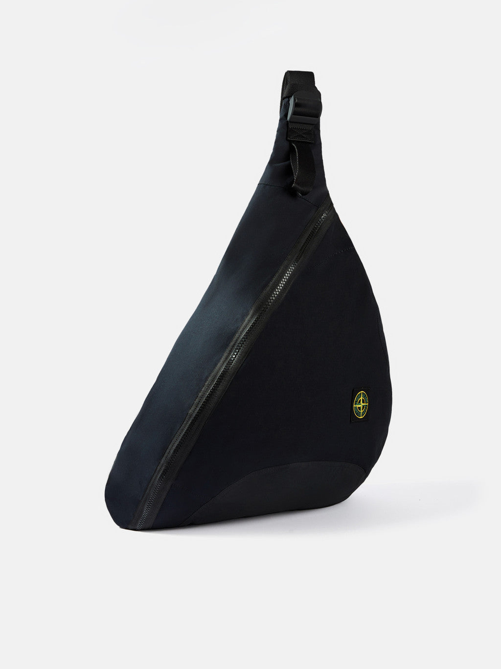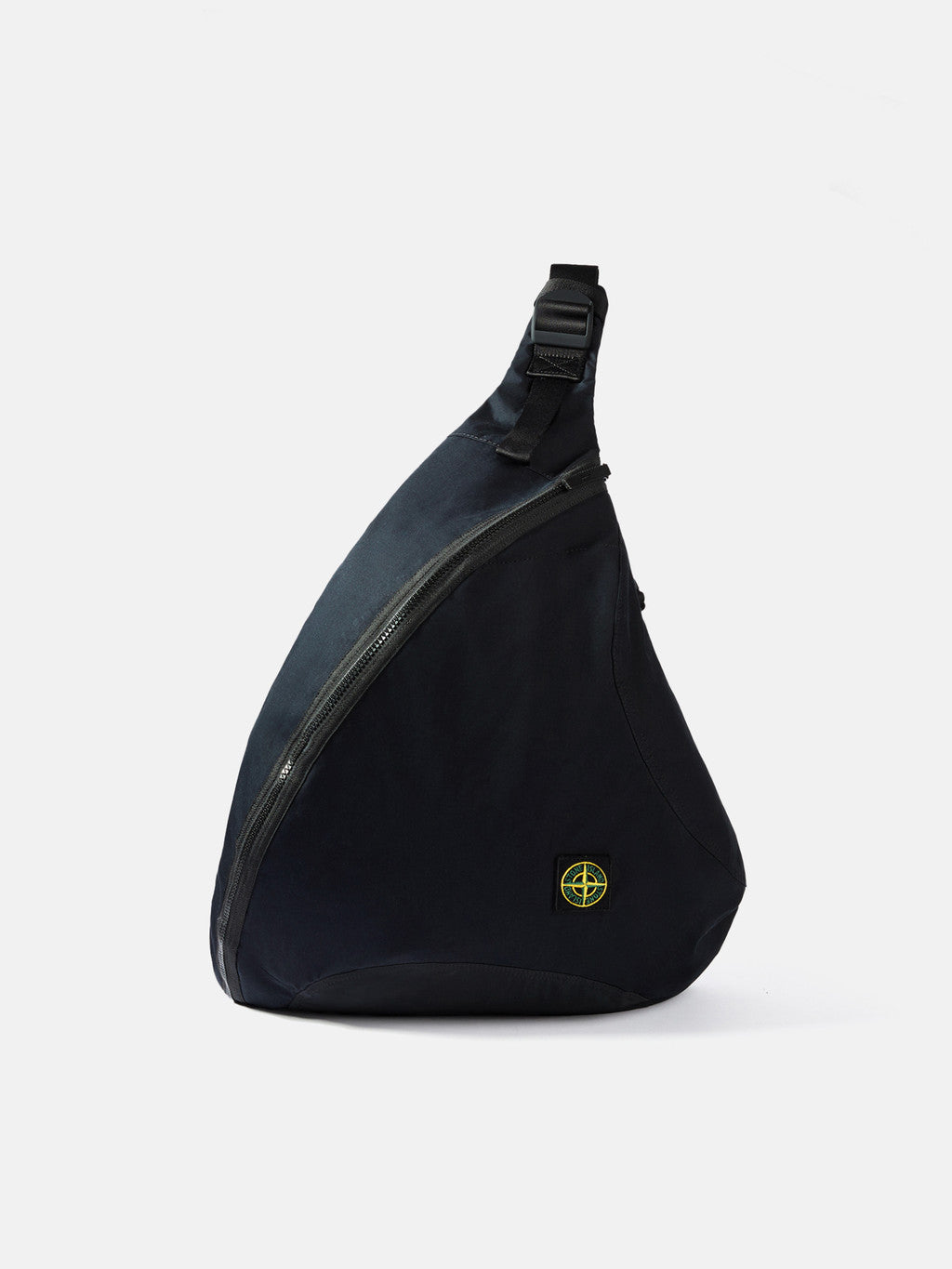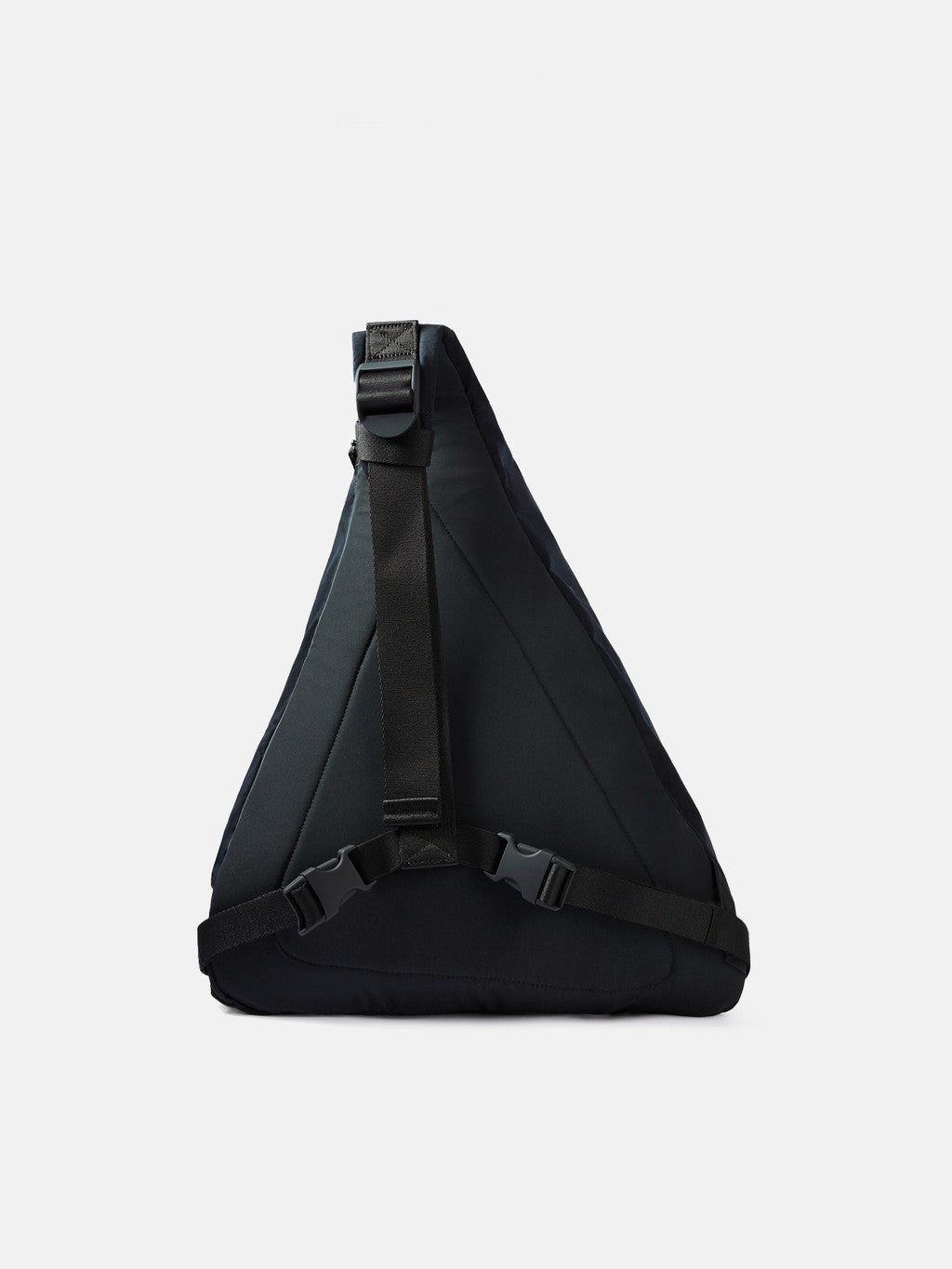 Sling bag made from a 50Ne pure cotton poplin, laminated to an aluminium foil and protected by a second layer of the same poplin.