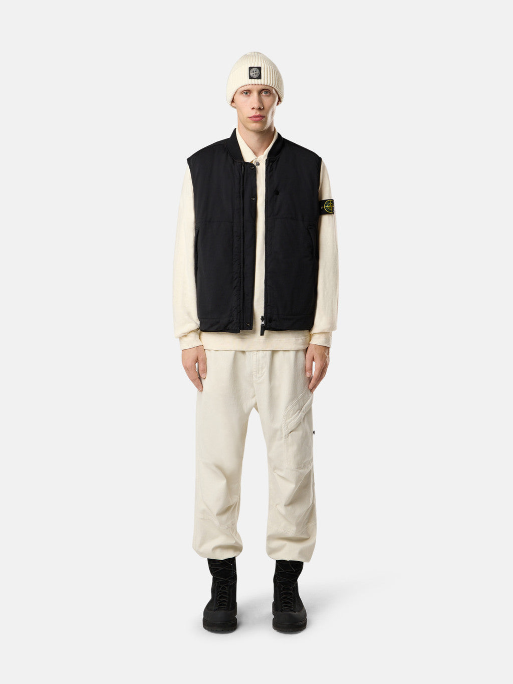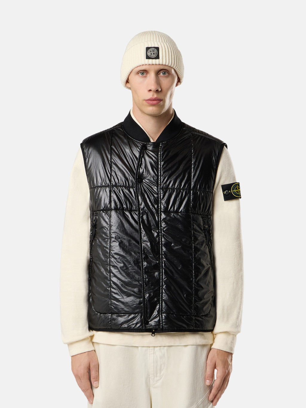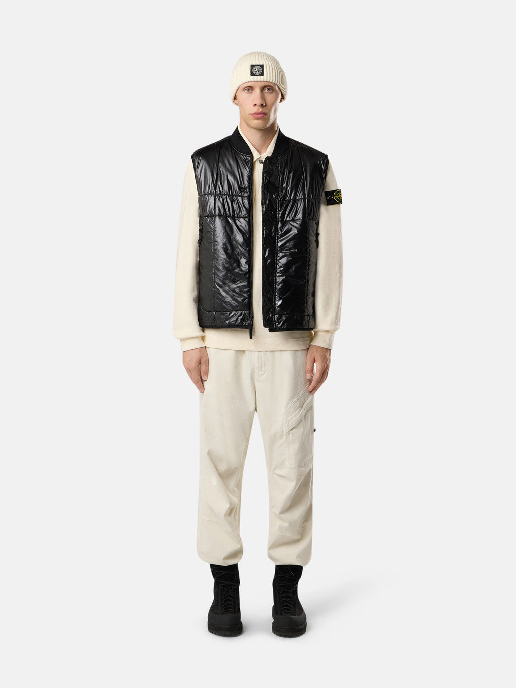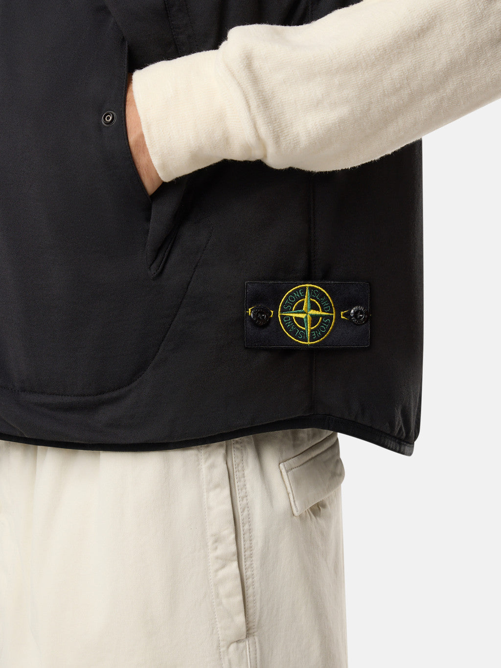 Reversible garment. On one side, compact jersey composed of mako cotton and nylon and on the other, nylon coated with a glossy polyurethane resin. Garment dyed with a double colour recipe.