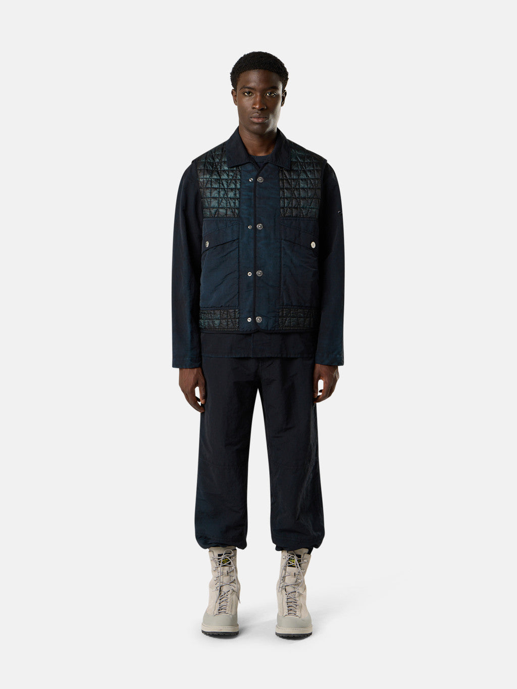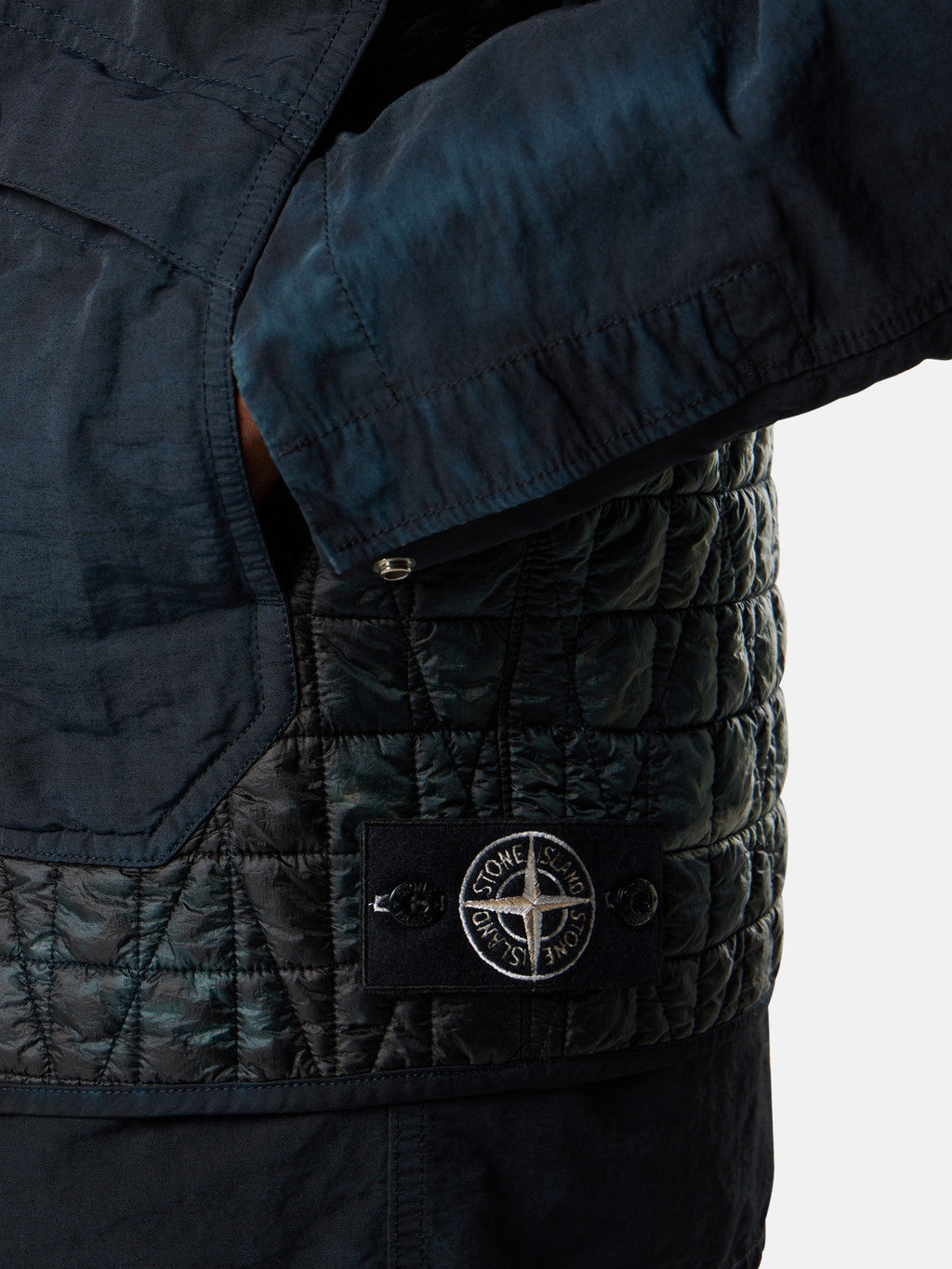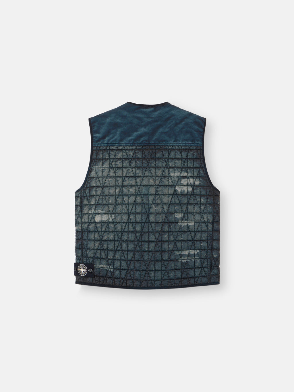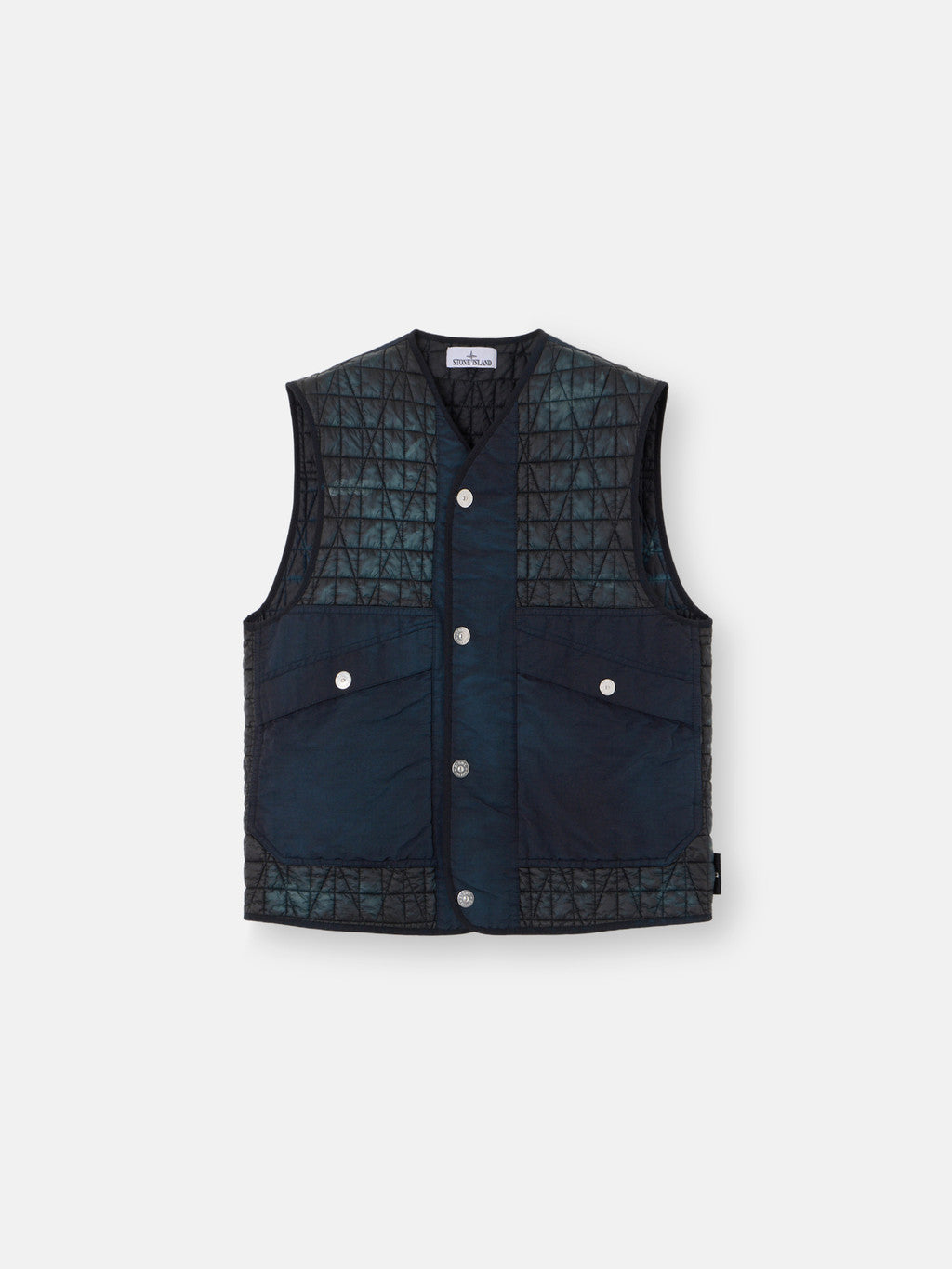 Quilted vest made from a lightweight, ultra-tightly woven recycled nylon reps, resin-coated on the inside for wind resistance and moderate water resistance and quilted with a multi-axial pattern onto an inner padding layer. Garment dyed with carefully selected dyes, then faded through an innovative corrosion treatment, reflecting Stone Island's ongoing commitment to research and experimentation. The corroded areas take on a worn appearance and varying colours due to the irregularity of the treatment, creating a blurred effect and making each piece unique. Treated with a specific anti-drop agent. Multiaxial quilting padded with PrimaLoft .