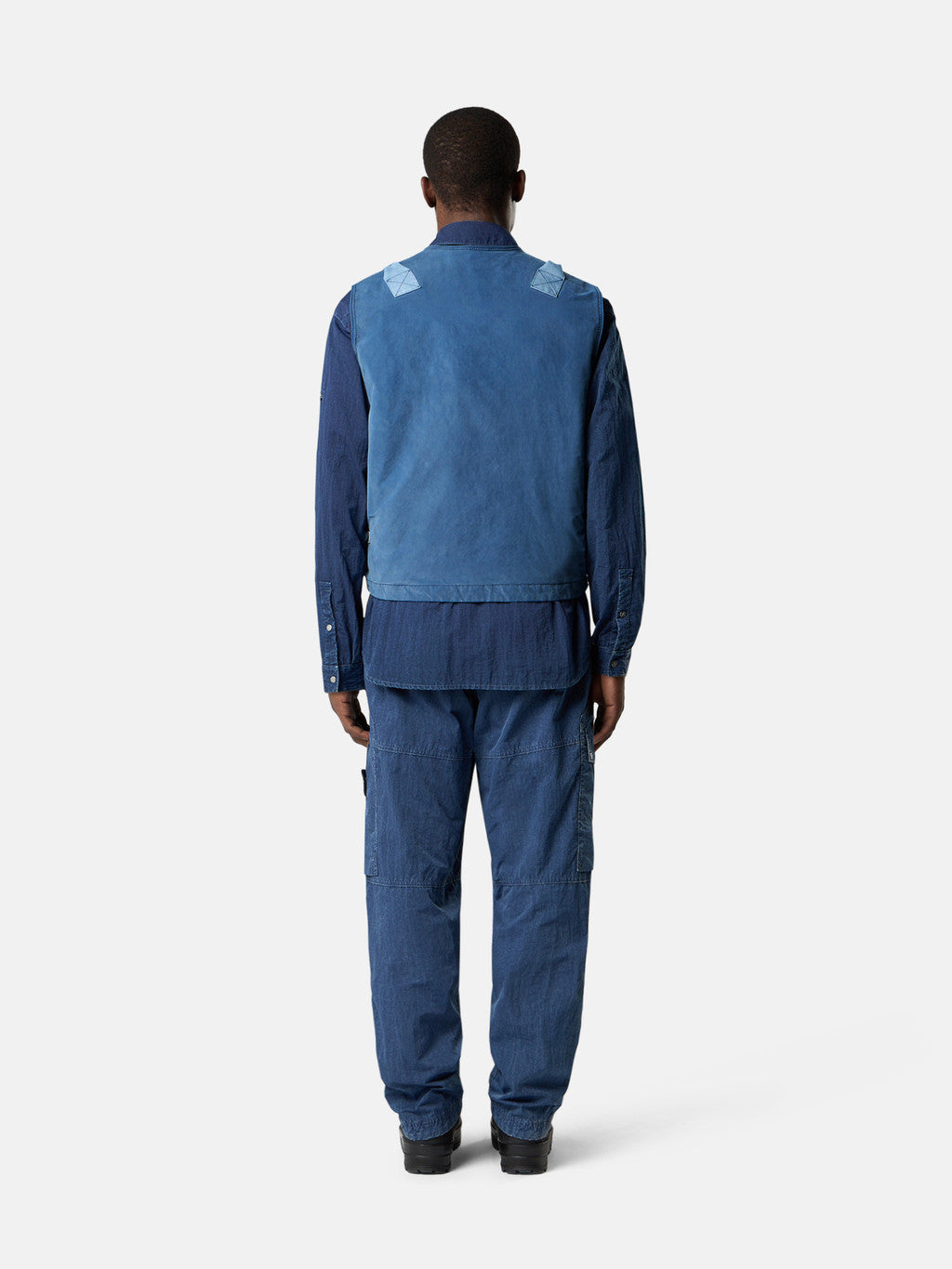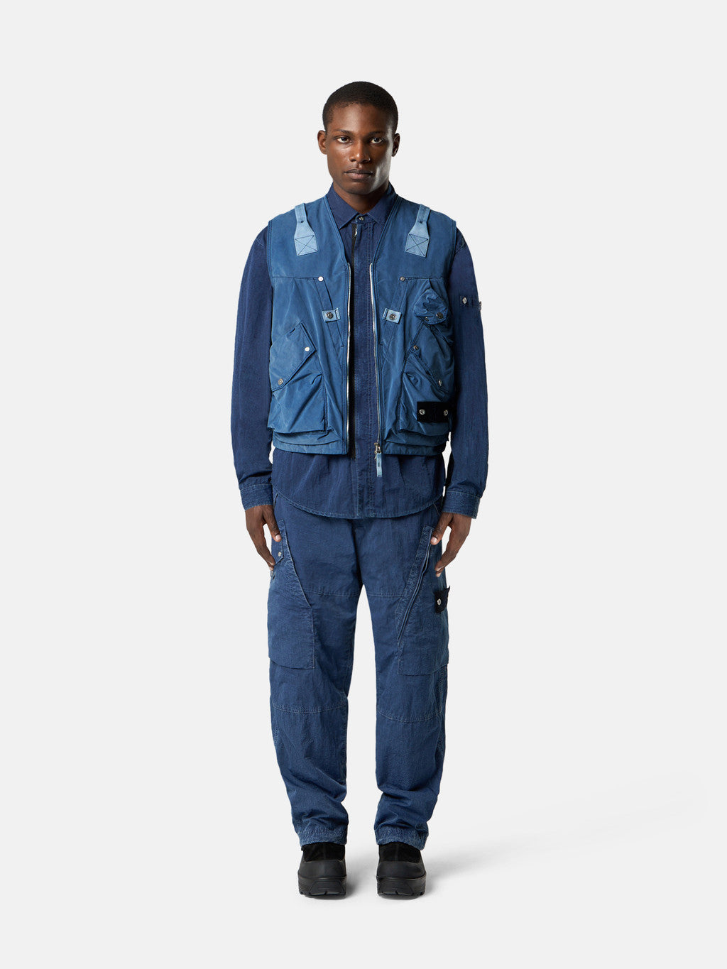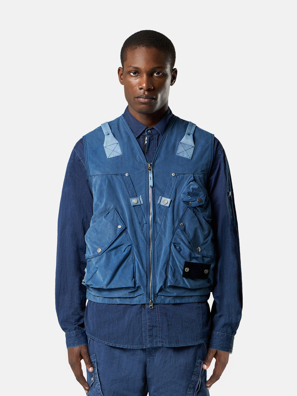 Utility vest made from a lightweight tela woven with Japanese polyester/polyamide yarns featuring a star-shaped cross-section. The pieces are assembled and then dyed with indigo pigment and the addition of an anti-drop agent in a complex and exclusive dyeing process. During the garment dyeing process, the heat radically transforms the material's hand and structure. The innovative combination of indigo and man-made fibres reflects Stone Island's constant dedication to research and experimentation.
