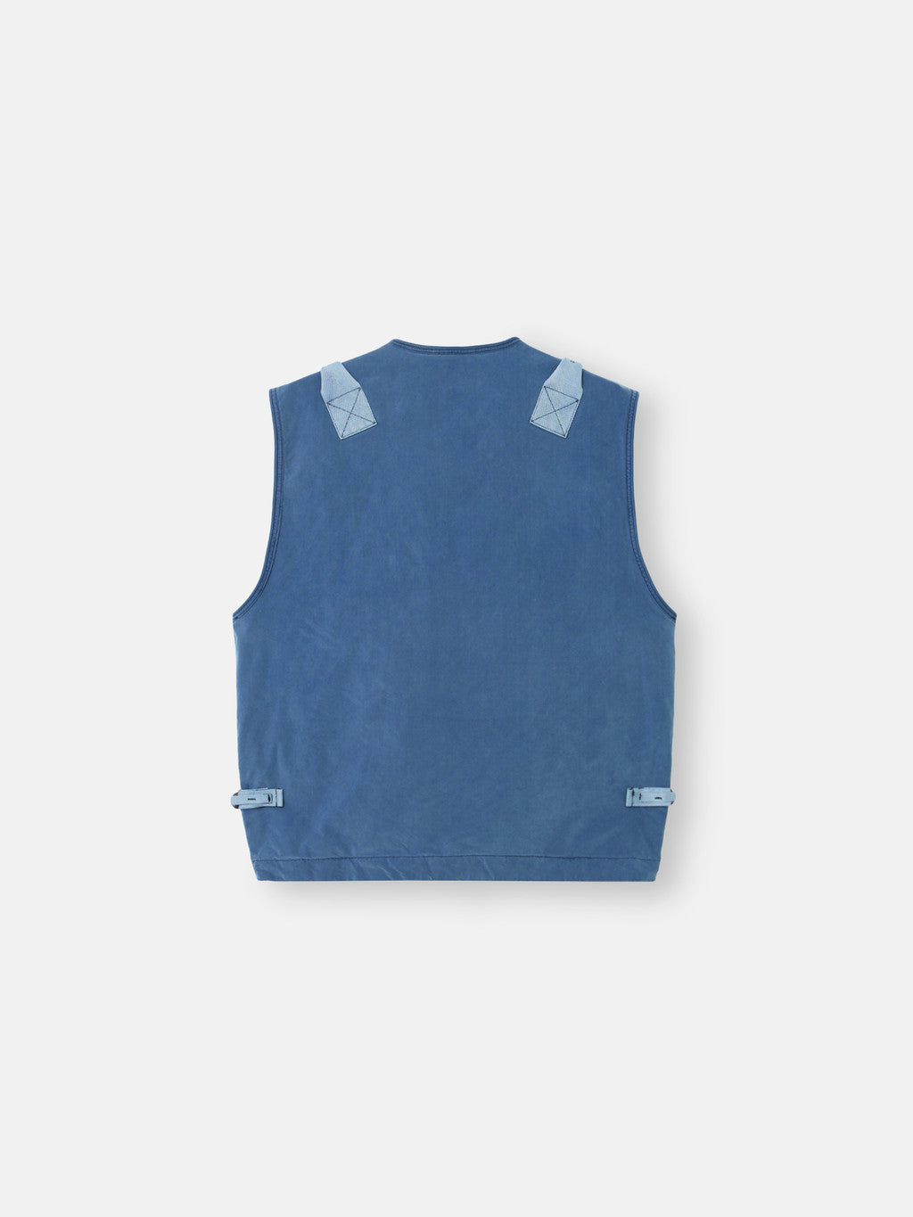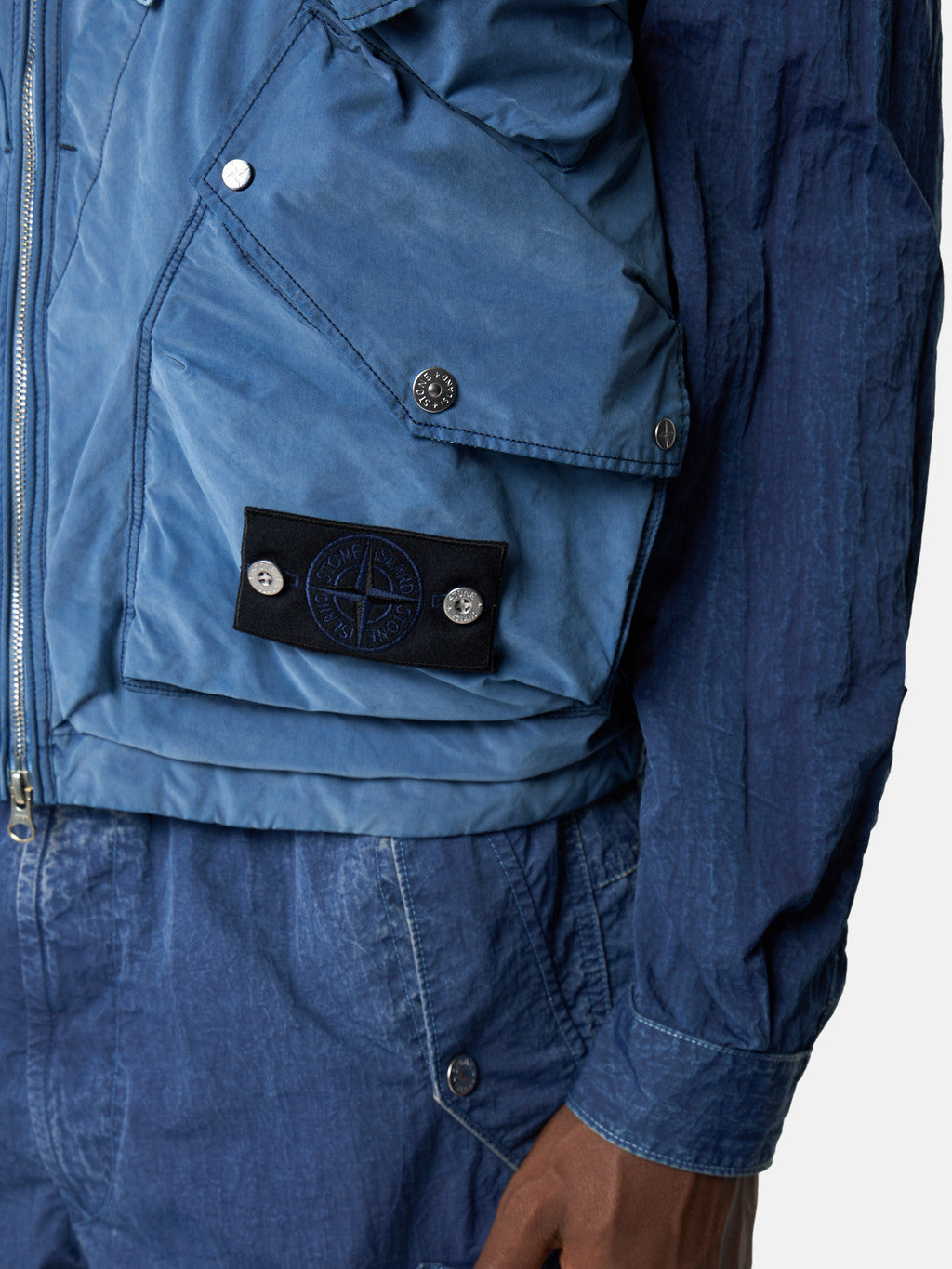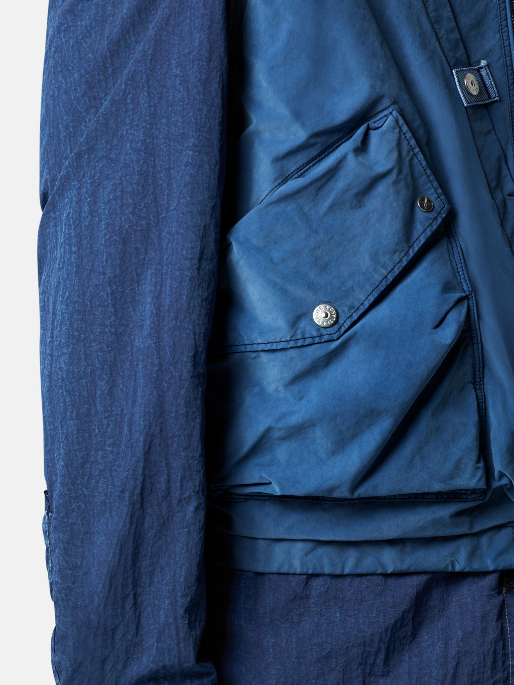 Utility vest made from a lightweight tela woven with Japanese polyester/polyamide yarns featuring a star-shaped cross-section. The pieces are assembled and then dyed with indigo pigment and the addition of an anti-drop agent in a complex and exclusive dyeing process. During the garment dyeing process, the heat radically transforms the material's hand and structure. The innovative combination of indigo and man-made fibres reflects Stone Island's constant dedication to research and experimentation.