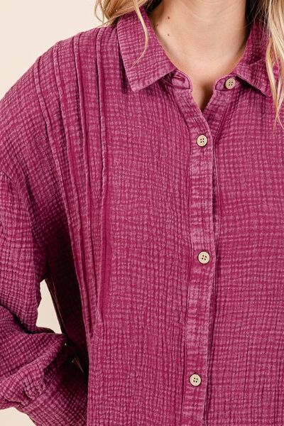 A mineral wash cotton gauze ruffle midi shirt dress is a stylish and versatile piece that combines the casual feel of a shirt dress with the feminine touch of ruffle details. The mineral wash gives the cotton fabric a soft, lived-in look, adding a touch of texture and character to the dress. The midi length falls somewhere between the knee and ankle, offering a modest and chic silhouette. Ruffle detailing adds a playful and romantic element to the dress, while the shirt dress style features a button-down front and a collar for a classic and polished look. This type of dress is perfect for effortless and on-trend outfits that can be dressed up or down for various occasions.