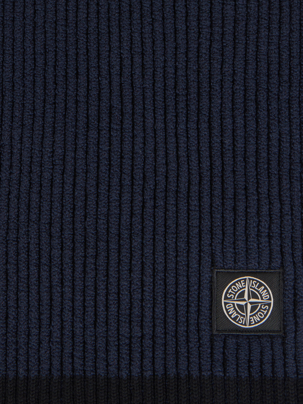 Knit scarf with full ribbing in RWS certified wool with two different coloured yarns, worked with the VANISE technique to obtain a deeper perception of the rib and contrasting colour placements. Gauge 7. The Responsible Wool Standard (RWS) describes and certifies animal welfare and land management practices in wool production and tracks the certified material from farm to final product.