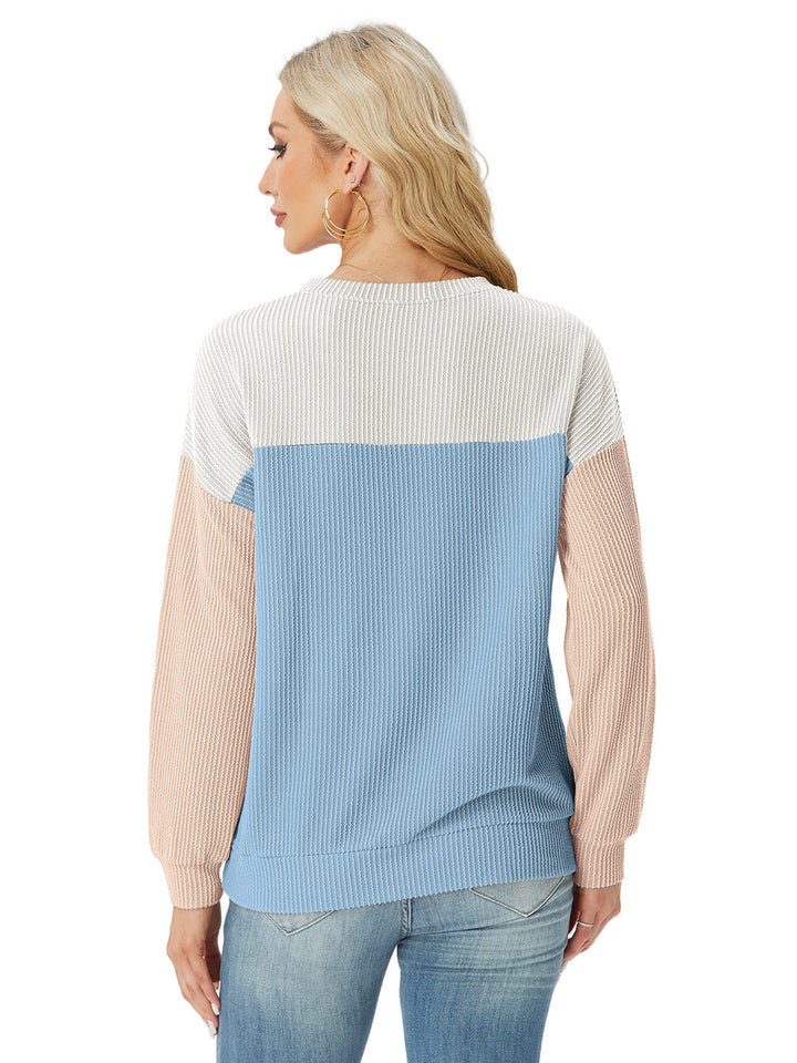 Update your wardrobe with our stylish Color Block Ribbed Tops. Made with high-quality materials, these tops offer both comfort and durability. The color block design adds a trendy touch, perfect for any occasion. The long sleeves provide extra coverage, while the crewneck adds a classic and elegant look. Whether you're dressing up or down, our tops are a versatile addition to your collection.