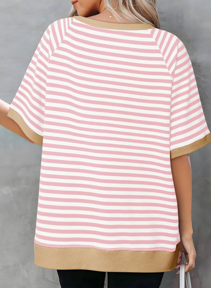 Elevate your casual wardrobe with our oversized striped color block tops! Crafted with a comfortable crewneck and short sleeves, these tees offer a loose fit for a relaxed and laid-back look.